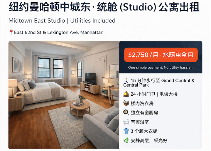 纽约曼哈顿中城东Studio 公寓出租|免佣金